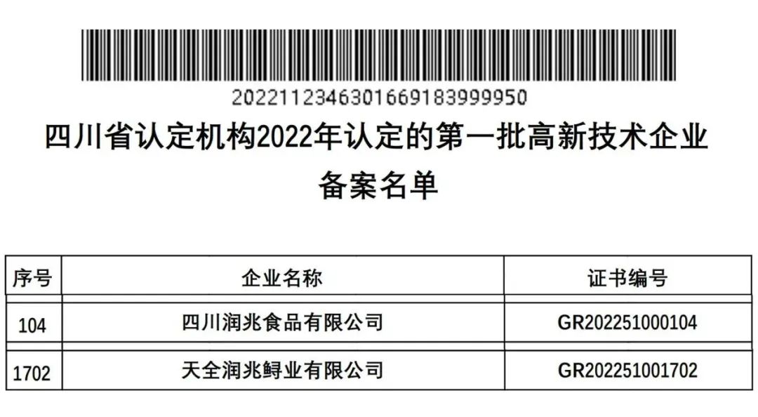 11月23日,四川润兆食品有限公司与天全润兆鲟业有限公司双双通过了由四川省科学技术厅、四川省财政厅、四川省国家税务局和四川省地方税务局联合组织的国家高新技术企业认定。目前,四川润兆旗下已有3家企业荣获国家高新技术企业荣誉称号。